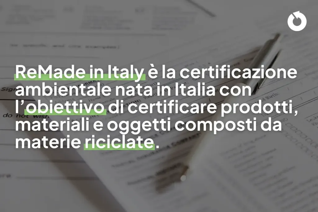 La Certificazione ReMade in Italy è la prima certificazione di prodotto di carattere volontario a nascere in Italia con l’obiettivo di certificare oggetti e materiali realizzati, anche parzialmente, con materiali provenienti da riciclo e i cui processi produttivi avvengono all’interno della nazione.